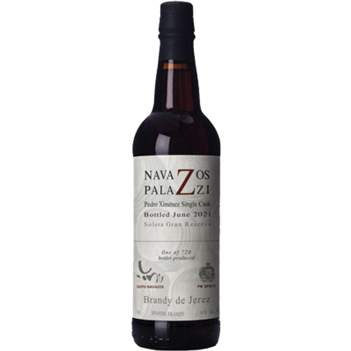 Navazos-Palazzi Pedro Ximénez Single Cask Brandy de Jerez is a 35-60+ year old bottling of pot-distilled Spanish brandy, distilled from Airén and Palomino grapes. After aging in casks that previously held dry Oloroso sherry for 30+ years, the spirit was moved toa freshly-emptied cask that previouslycontained very old Pedro Ximénez Sherry for 4 more years. The average age of this bottling is 35 years, but owing to the traditional solera system aging in Jerez, the final product contains some brandy over 60 years old.Navazos Palazzi
